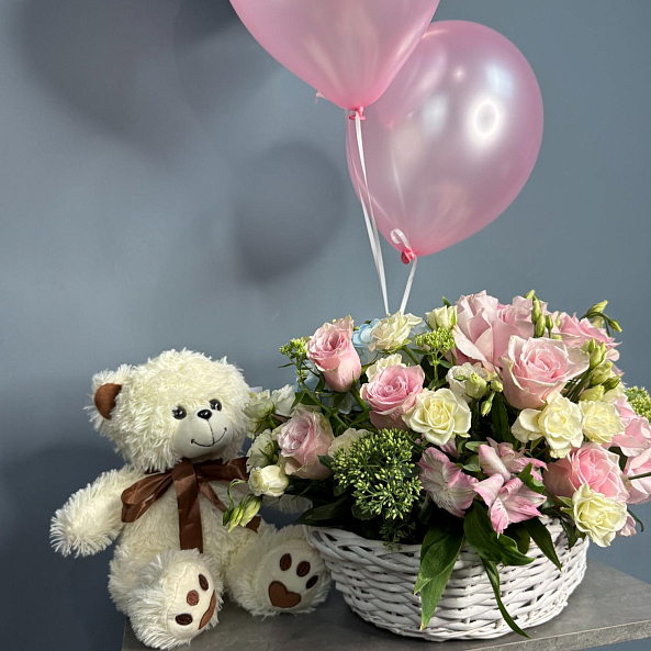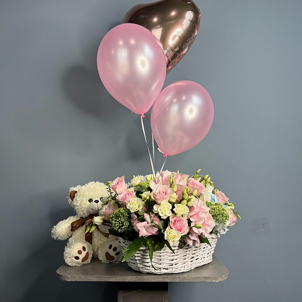 Подарочный набор "На День Рождения" , Корзина цветов, Мягкая Игрушка, Шары, Коробка Конфет.