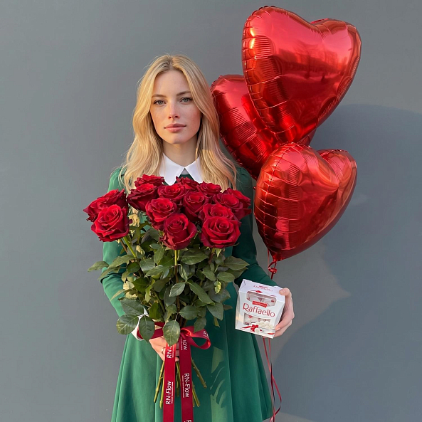 Этот изысканный набор — настоящая симфония страсти и внимания, где 15 роз Эквадор высотой 70 см, 3 красных фольговых шара в форме сердца и коробка конфет Raffaello сливаются в единый волшебный образ, словно застывший момент из самой романтической сказки. Каждая деталь, от бархатистых лепестков до блестящего шара, дарит ощущение глубины чувств и заботы, а конфеты добавляют сладкую нотку в композицию.