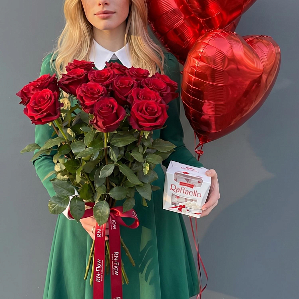 Подарочный Набор «Красная Симфония: 15 Роз Эквадор, Сердечные Шары и Конфеты Raffaello»