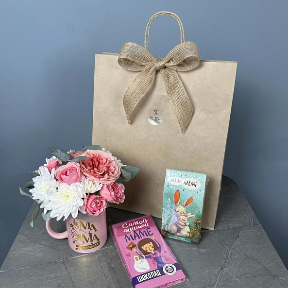 Нежный букет в розовой кружке с надписью *«МАМА ЛЮБИМАЯ»*, шоколад с трогательной открыткой *«Самой лучшей маме»* и уютный чай в подарочной упаковке — всё, чтобы порадовать и согреть сердце. Упаковано в стильный крафт-пакет — готово к вручению.
