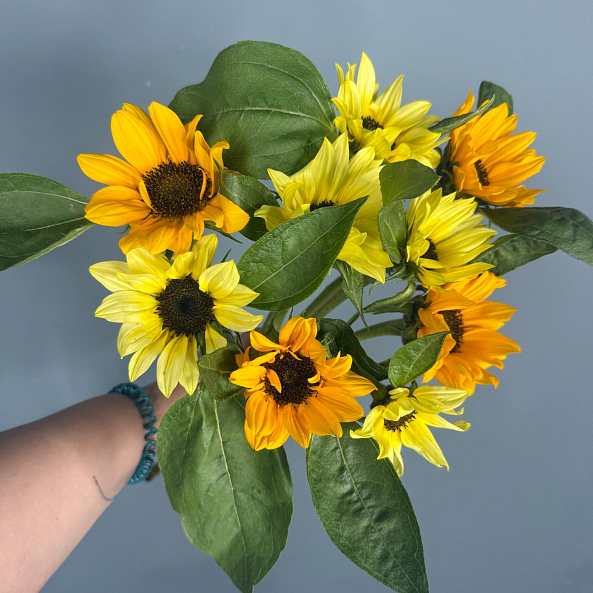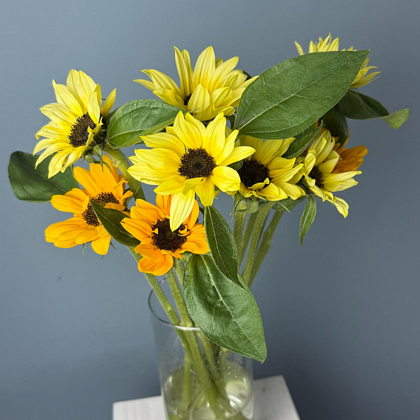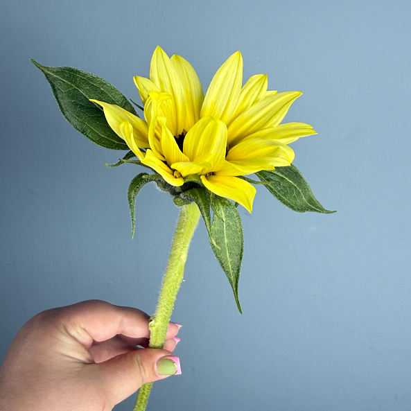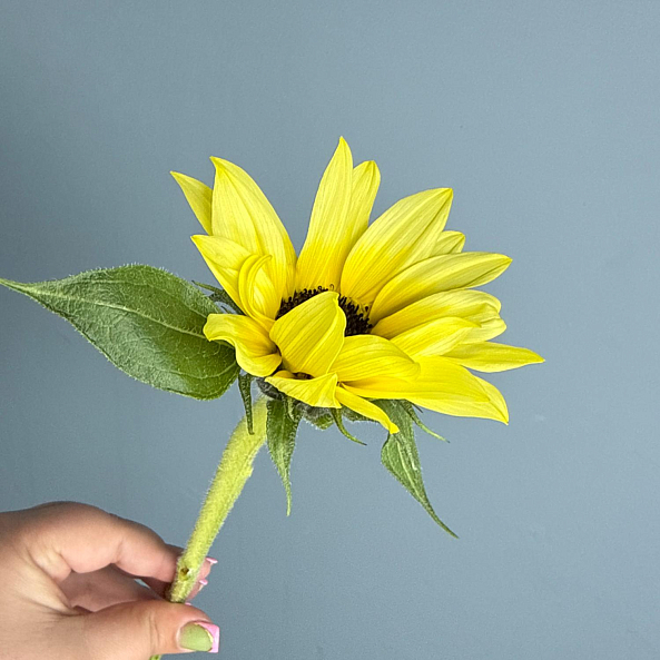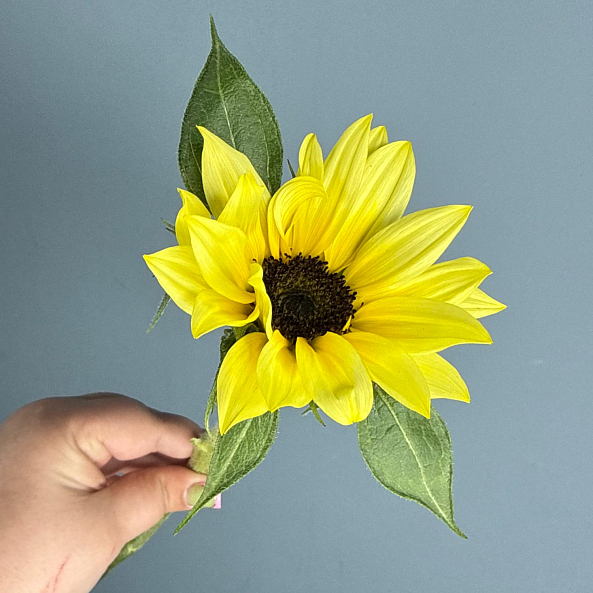 Этот очаровательный одиночный цветок — настоящая симфония тепла и позитива, где один яркий подсолнух в идеальной форме дарит ощущение солнечного дня даже в самый пасмурный час. Каждый лепесток, словно застывший луч света, и свежие зеленые листья создают компактную композицию, которая напомнит близкому человеку о вашей заботе и поддержке.