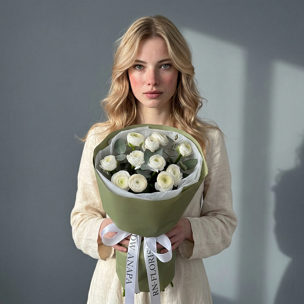 Этот изысканный букет из 11 белых мини-ранункулюсов — воплощение чистоты и вечной гармонии, словно застывший волшебный рассвет в лунном свете. Каждый бутон, с его компактной формой и многослойными бархатистыми лепестками, дарит ощущение спокойствия и утонченной элегантности, а стебли длиной 30–35 см создают изящную композицию, которая завораживает своей простотой и глубиной. Упакованный в зеленую крафт-бумагу с белой лентой «RN-Flow», букет выглядит как произведение искусства — идеально дополняя романтический образ или торжественное мероприятие. диаметр бутона цветка 1-2 см