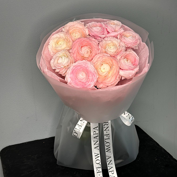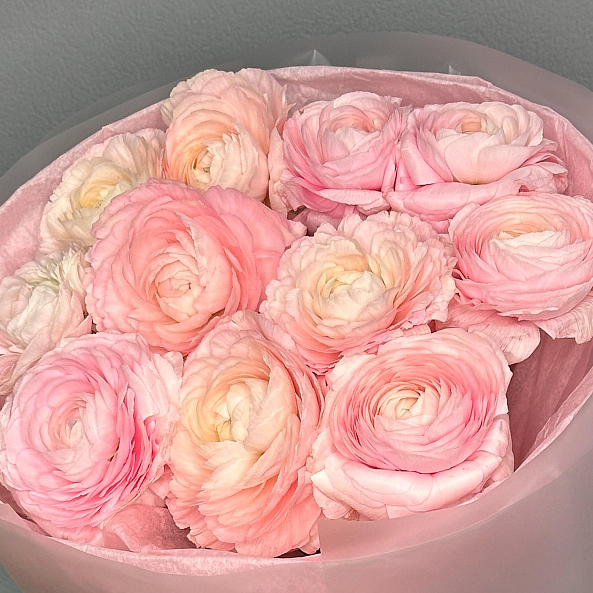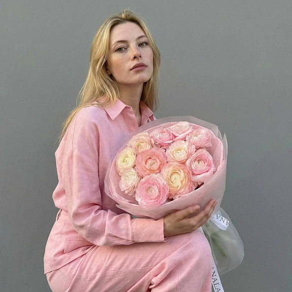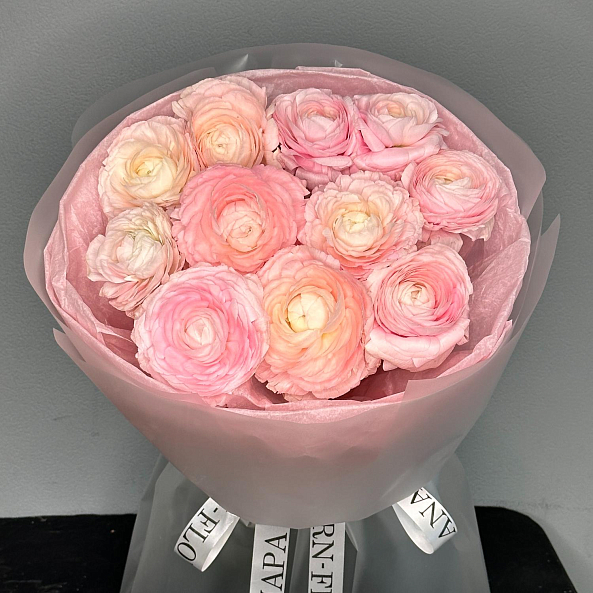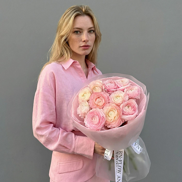 Этот изысканный букет из 11 розовых ранункулюсов (лютиков) — нежное переплетение пастельных оттенков, словно застывший волшебный закат. Каждый бутон, с его многослойными лепестками и плавным переходом от кремового к нежно-розовому, дарит ощущение тепла и изысканности. Пышные соцветия, напоминающие миниатюрные розы, создают объемную и динамичную композицию, а аккуратные ветки эвкалипта добавляют свежести и естественной гармонии. Упакованный в розовую кальку с атласной лентой «RN-Flow», букет выглядит лаконично и стильно, идеально дополняя как повседневный образ, так и особый момент.