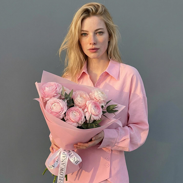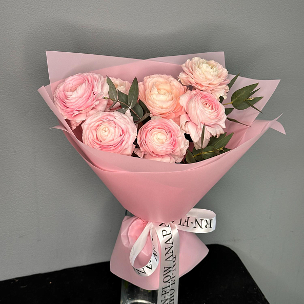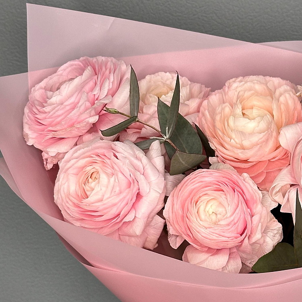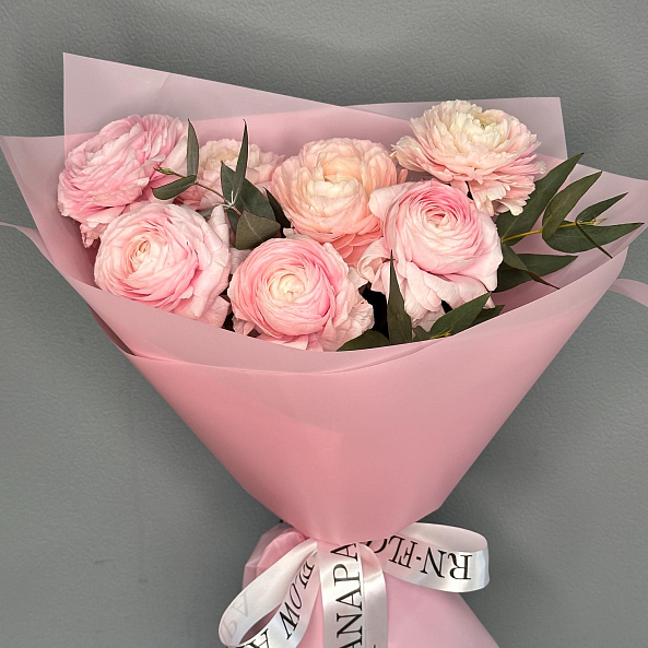 Этот изысканный букет из 7 розовых ранункулюсов (лютиков) — нежное переплетение пастельных оттенков, словно застывший весенний рассвет. Каждый бутон, с его многослойными лепестками и плавным переходом от кремового к нежно-розовому, дарит ощущение уюта и романтики. Пышные соцветия, напоминающие миниатюрные розы, создают объемную композицию, а аккуратные ветки эвкалипта добавляют свежести и естественной гармонии. Упакованный в розовую кальку с атласной лентой «RN-Flow», букет выглядит лаконично и стильно, идеально дополняя как повседневный образ, так и особый момент.
