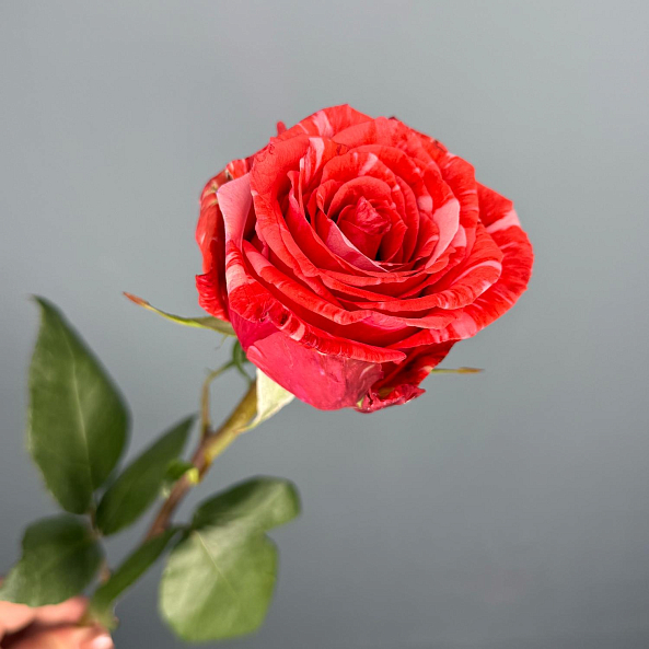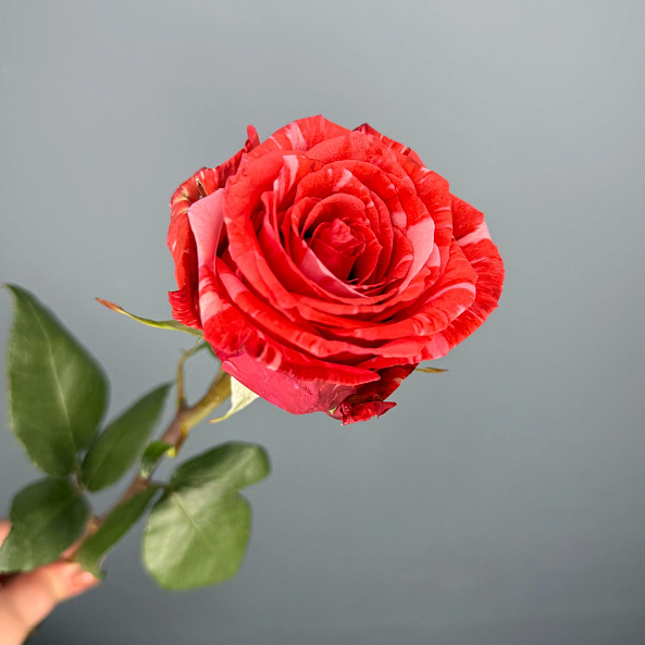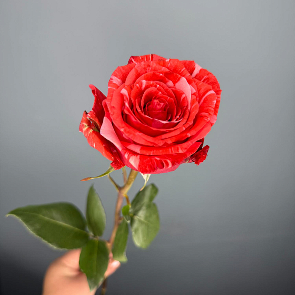 Глубокий красный с белыми прожилками, словно мраморная венеция на лепестках. Каждая роза — уникальна: как будто природа решила создать шедевр. Идеальна для романтического жеста, первого признания или подарка, который запомнится навсегда.