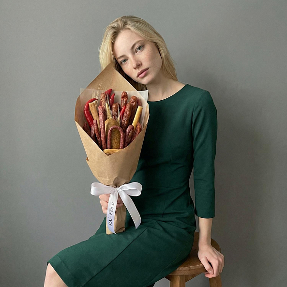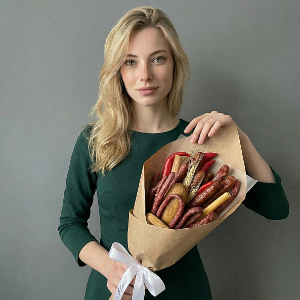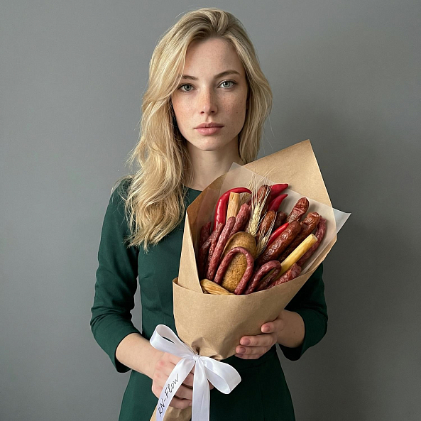 Этот необычный букет — идеальный подарок для тех, кто ценит юмор и практичность! Вместо цветов — аппетитное ассорти закусок, аккуратно собранное в форму настоящего цветочного шедевра: