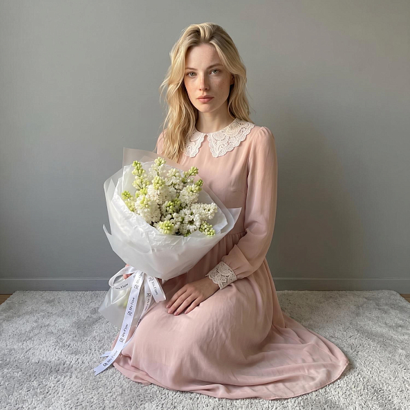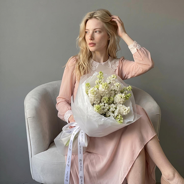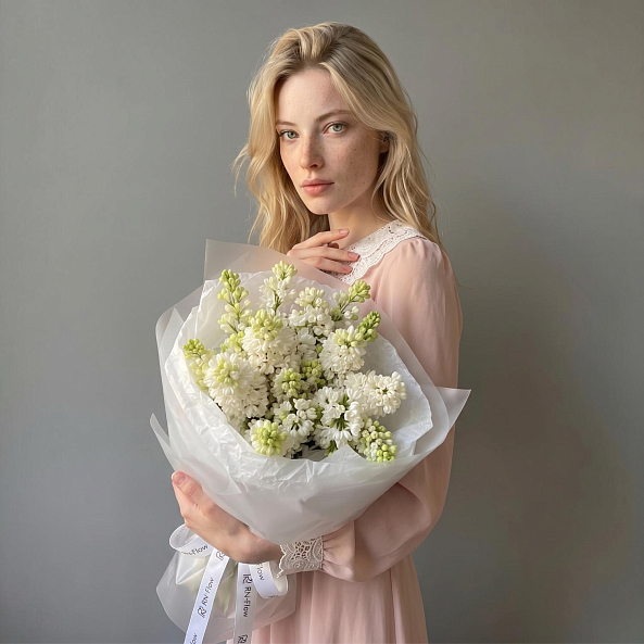 Этот очаровательный букет — настоящая симфония весеннего пробуждения, где 7 веток белой сирени из России в нежных оттенках создают компактную, ароматную композицию, словно застывший момент из самого романтического сада. Каждое соцветие, с его изящными лепестками и легким ароматом, дарит ощущение тепла и чистоты, а свежие зеленые стебли подчеркивают естественную гармонию. Упакованный в прозрачную кальку с атласной лентой «RN-Flow», букет выглядит лаконично и стильно, идеально дополняя как повседневный образ, так и особый момент.