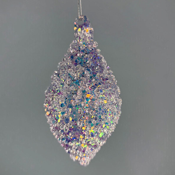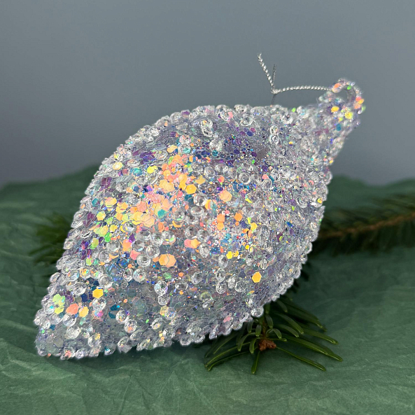 Серебряная стеклянная капля, усыпанная кристаллами и голографическими блёстками — это не просто украшение, а настоящий акцент на вашей ёлке. Идеальна для тех, кто ценит изысканность, блеск и атмосферу праздника.