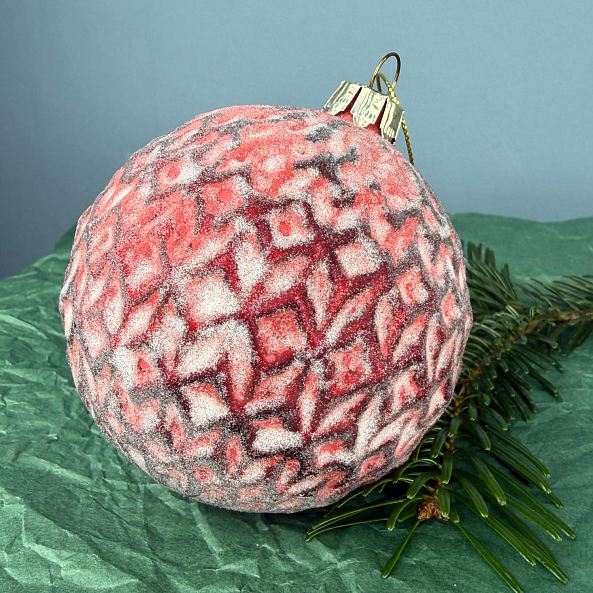 Красный стеклянный шар с рельефным узором и эффектом «снежной пудры» — не просто украшение, а настоящий акцент на вашей ёлке. Идеален для тех, кто ценит изысканность, блеск и атмосферу праздника.