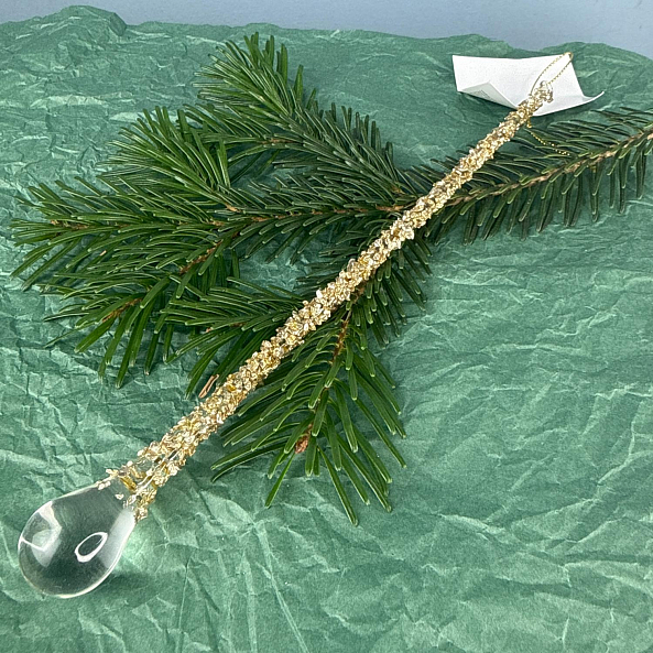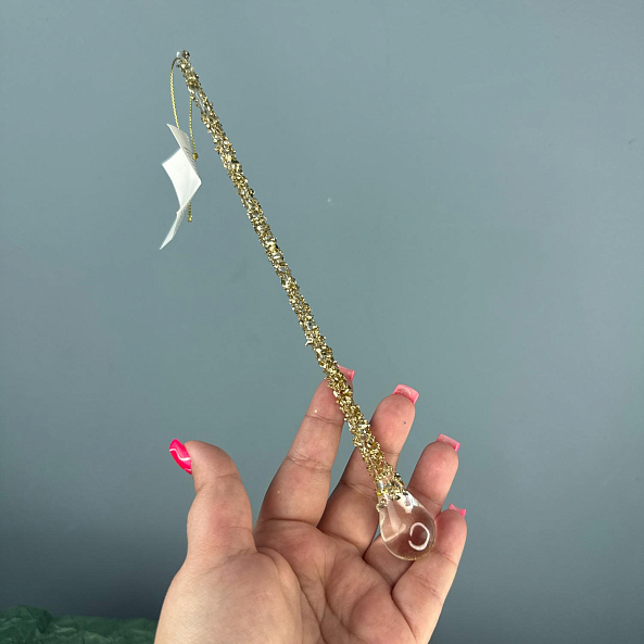 Длинная стеклянная сосулька, усыпанная золотым глиттером — не просто украшение, а настоящий акцент на вашей ёлке. Идеальна для тех, кто ценит изысканность, блеск и атмосферу праздника.