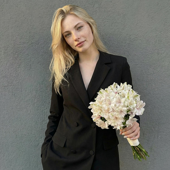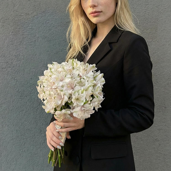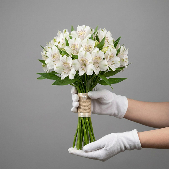 Белая альстромерия с нежными прожилками — это не просто цветы, а символ чистоты, любви и долгой жизни вместе. Идеален для невесты, которая ценит простоту, доброту и гармонию.