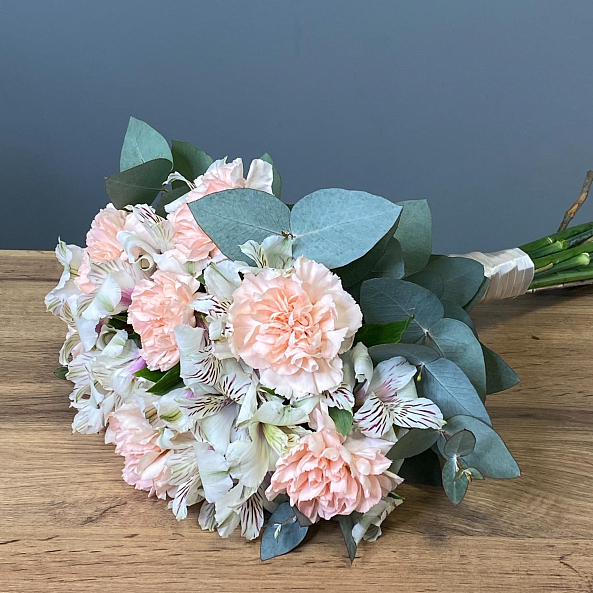 В составе: гвоздики персиковые, альстромерии белые, эвкалипт