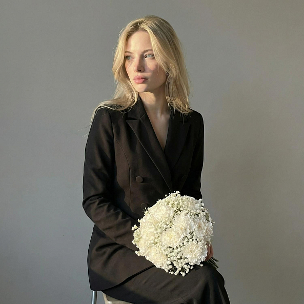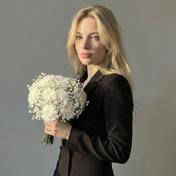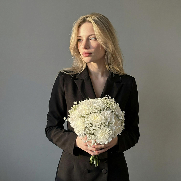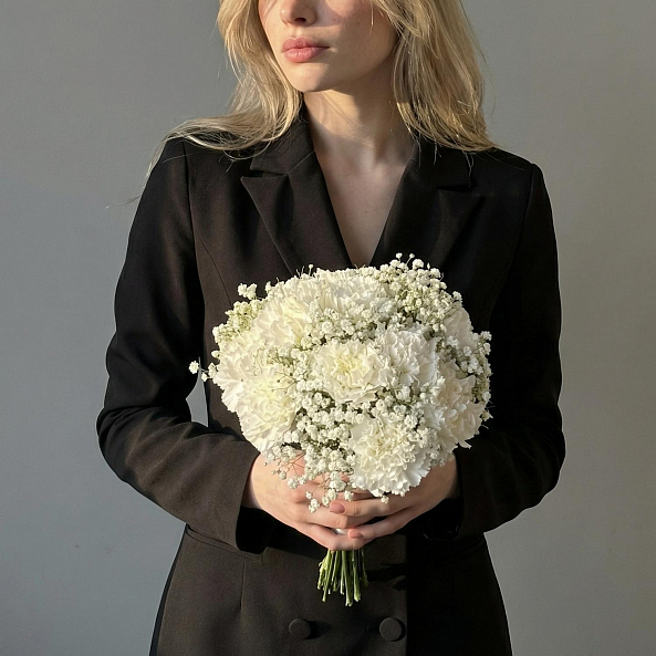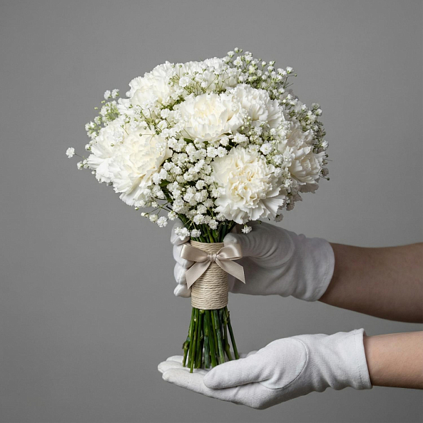 Белые диантусы и пушистая гипсофила — это не просто букет, а символ чистого сердца, доброты и бесконечной любви. Идеален для невесты, которая ценит простоту, изысканность и гармонию.