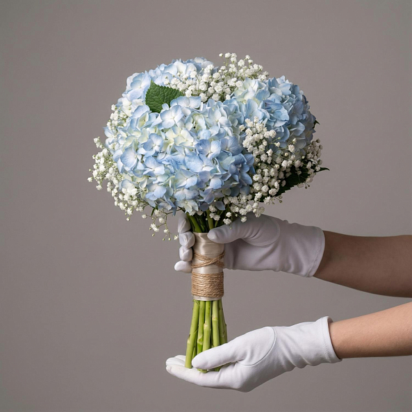 Голубая гортензия и белая гипсофила — это не просто букет, а символ вашего особенного дня. Идеален для невесты, которая ценит минимализм, изысканность и нежность.