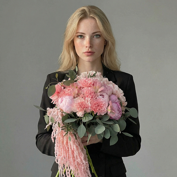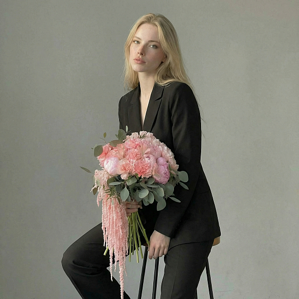 Для воздушности и динамики мы добавили пушистые розовые амаранты, создающие эффект «водопада» и придающие букету современный шик. Свежесть и контраст обеспечивают серебристо-зеленые листья эвкалипта, которые не только украшают, но и наполняют ароматом.