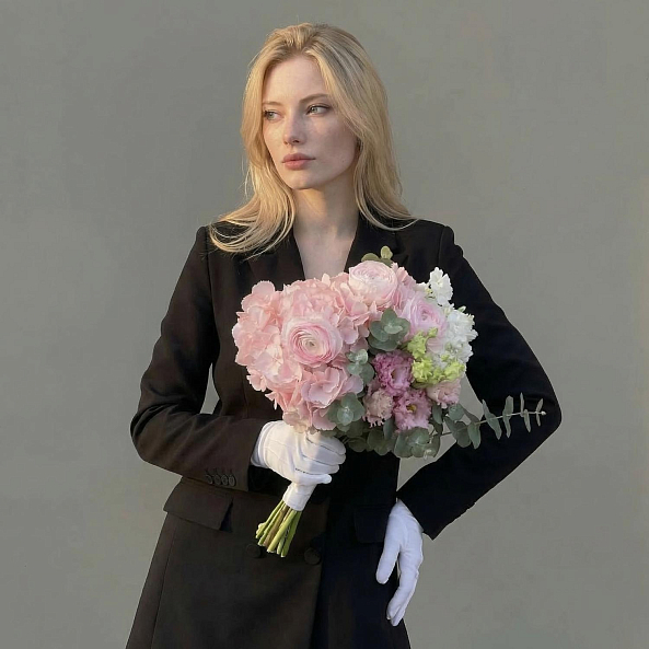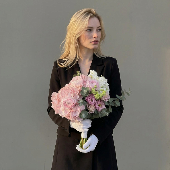 Этот изысканный свадебный букет — нежное переплетение гортензии, ранункулюсов, эустомы, маттиолы и эвкалипта, словно застывший волшебный рассвет в пастельных тонах. Каждый цветок, от пышных соцветий гортензии до ароматных веток маттиолы, дарит ощущение тепла и уюта, а аккуратные листья эвкалипта придают композиции свежесть и естественную гармонию. Упакованный в белую кальку с атласной лентой «RN-Flow», букет выглядит лаконично и стильно, идеально дополняя образ невесты и создавая атмосферу нежности на вашем торжестве.