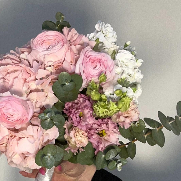 Свадебный букет. Гортензия, Ранункулюс (Лютик), Эустома, Маттиола, Эвкалипт.