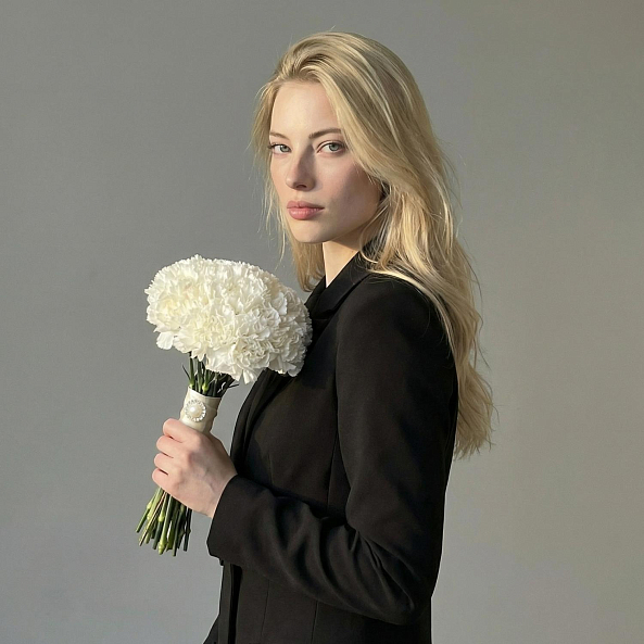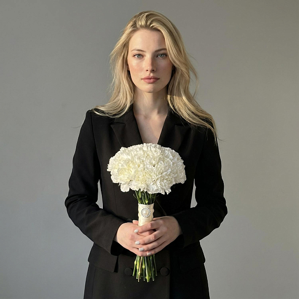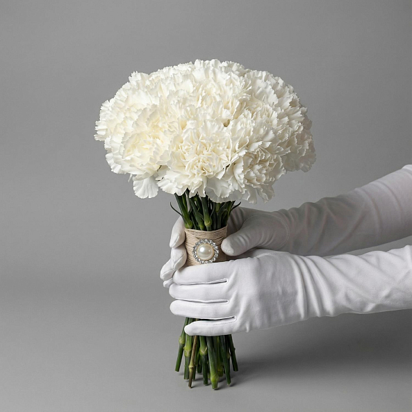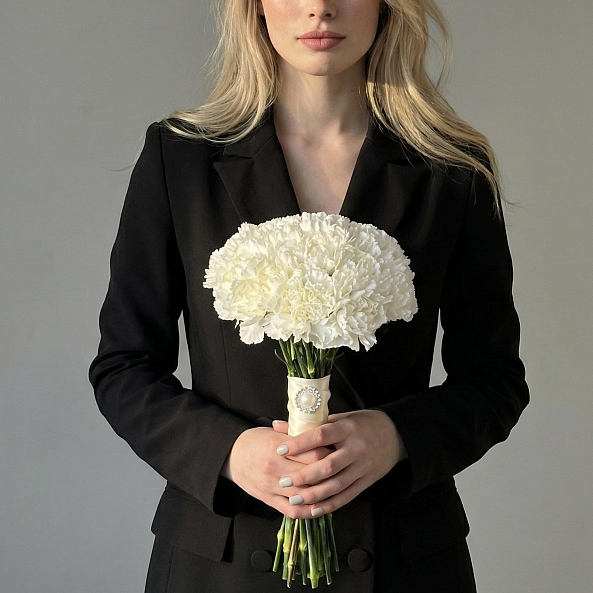 Белые гвоздики — это не просто цветы, а символ чистоты, любви и долгой жизни вместе. Идеален для невесты, которая ценит простоту, доброту и гармонию.