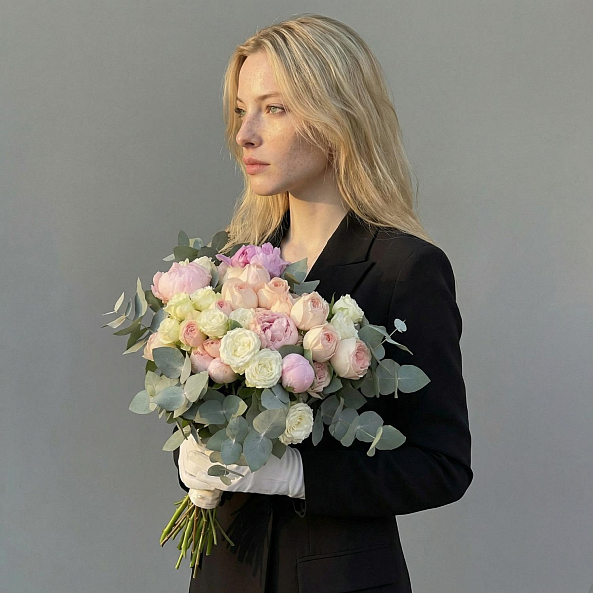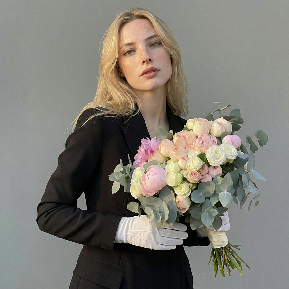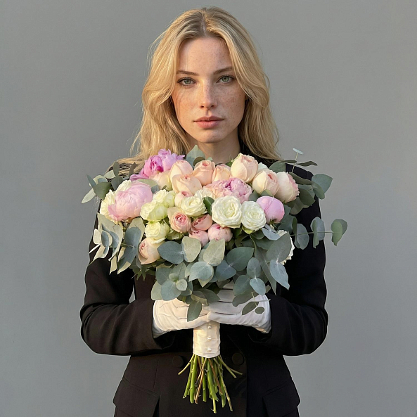 Этот букет — воплощение изысканной классики и современной элегантности, созданной для самого важного дня в жизни. В композиции гармонично переплетаются пышные пионы в нежно-розовых оттенках, кустовые розы кремового и белого цвета, символизирующие чистоту и нежность, и свежие веточки эвкалипта, придающие композиции естественную гармонию. Каждый лепесток, словно созданный для того, чтобы подчеркнуть красоту невесты, становится частью истории, которую вы будете вспоминать всю жизнь.