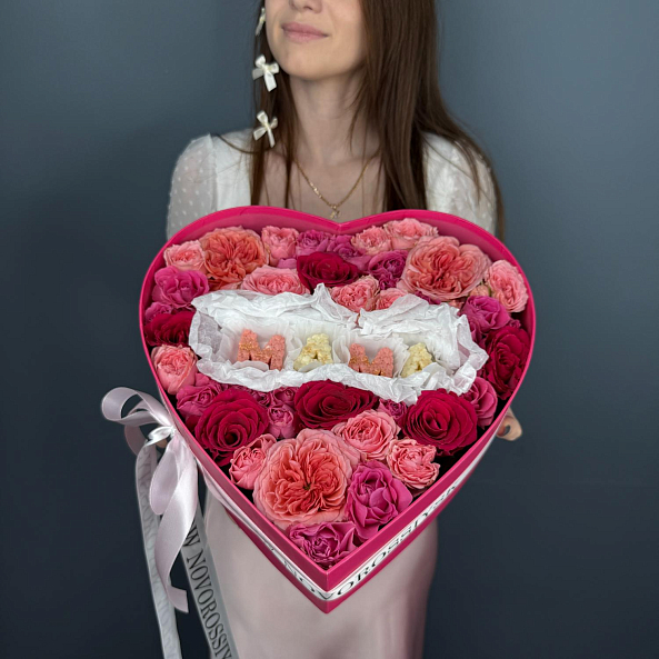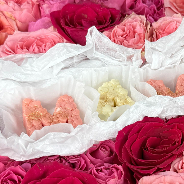 Роскошное сердце из розовых и бордовых роз — с нежной шоколадной надписью *«МАМА»* в центре, выполненной из сладких букв. Идеальный подарок для самой любимой — полный любви, заботы и восхищения.
