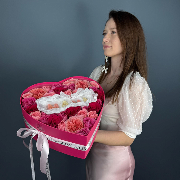 Цветы в коробке сердце с шоколадной надписью "Мама", Пионовидные Розы, Кустовые розы.