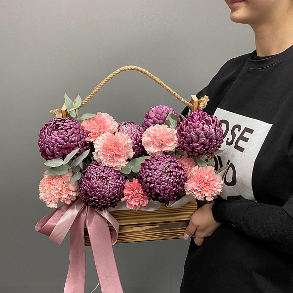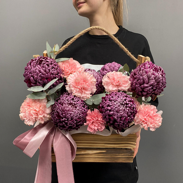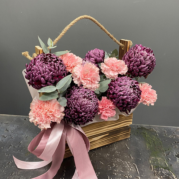 Ящик деревянный «Фиолетовый закат» — Хризантемы + Гвоздики