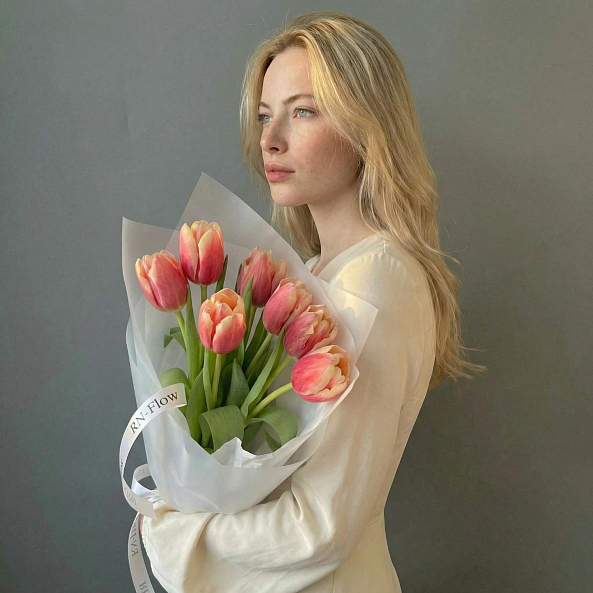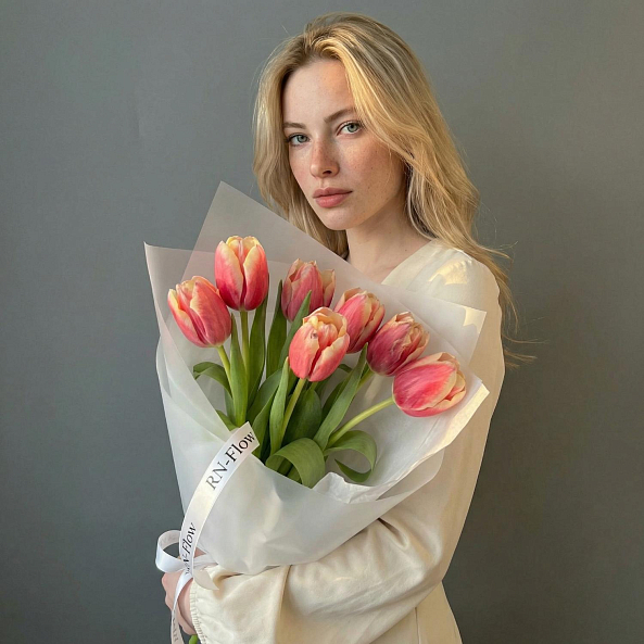 Этот букет — словно застывший момент весеннего заката, где нежные тюльпаны с плавным переходом от розового к теплому желтому создают ощущение уюта и свежести. Каждый бутон, словно раскрашенный рукой художника, переливается мягким светом, а зеленые стебли придают композиции естественную гармонию. Упакованный в прозрачную кальку с лентой «RN-Flow», букет выглядит лаконично и стильно, идеально дополняя любой образ — от романтического до современного.