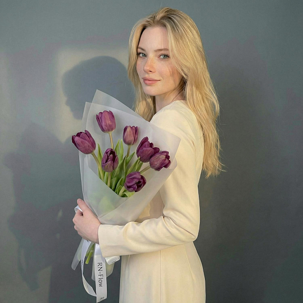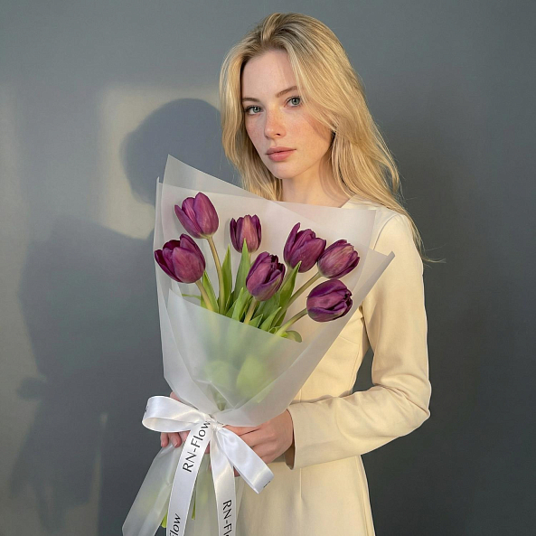 Этот букет — олицетворение таинственности и изысканной элегантности, где насыщенные фиолетовые тюльпаны, словно живые волны заката, создают атмосферу загадочного очарования. Каждый бутон, с его бархатистым оттенком и плавным переходом от глубокого лилового к нежному сиреневому, переливается мягким светом, даря ощущение уюта и утонченности. Зеленые стебли и листья придают композиции естественную свежесть, а прозрачная калька с атласной лентой «RN-Flow» подчеркивает минималистичную красоту букета.