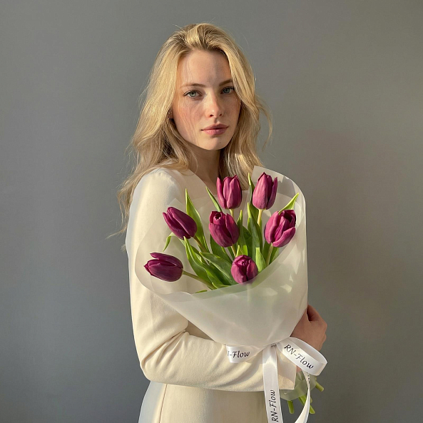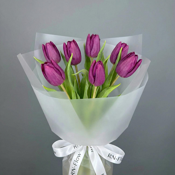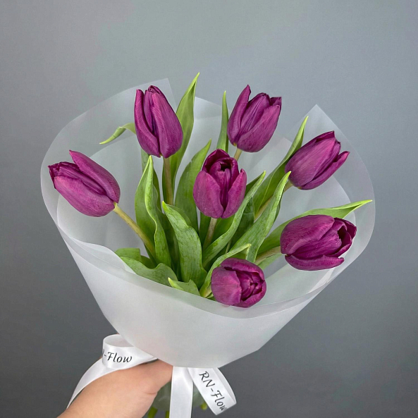 Этот букет — тихая симфония чувств, где насыщенные фиолетовые тюльпаны, словно капли утренней росы, создают атмосферу таинственности и изысканной нежности. Каждый бутон с его бархатистым оттенком и плавными изгибами лепестков переливается мягким светом, даря ощущение уюта и загадочного очарования. Зеленые стебли, аккуратно упакованные в прозрачную кальку с лентой «RN-Flow», подчеркивают минималистичную элегантность композиции, делая её идеальным акцентом для любого образа.