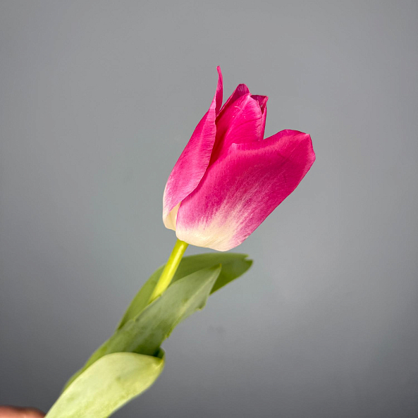 Этот изысканный тюльпан — словно застывший рассвет, где нежный розовый плавно перетекает в чистый белый, создавая ощущение хрустальной свежести и утонченной гармонии. Гладкиеелковистые лепестки без единого излома дарят ощущение легкости и чистоты, а плавные изгибы бутона напоминают о вечном балансе между страстью и нежностью. Каждый цветок, с его идеальным градиентом и хрустальной свежестью, словно вырезан из весеннего сада, а прочный стебель с зелеными листьями подчеркивает природную грацию и элегантность.