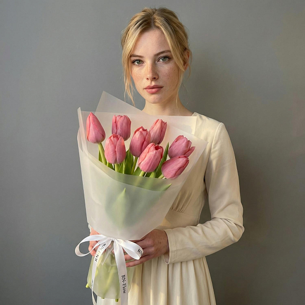 Этот букет — словно застывший момент весеннего утра, где нежные розовые тюльпаны, словно бархатные лепестки рассвета, создают атмосферу уюта и романтики. Каждый бутон, с его плавным переходом от персикового к розовому, переливается мягким светом, даря ощущение тепла и свежести. Зеленые стебли, аккуратно упакованные в прозрачную кальку с лентой «RN-Flow», подчеркивают минималистичную элегантность композиции, делая её идеальным акцентом для любого образа.