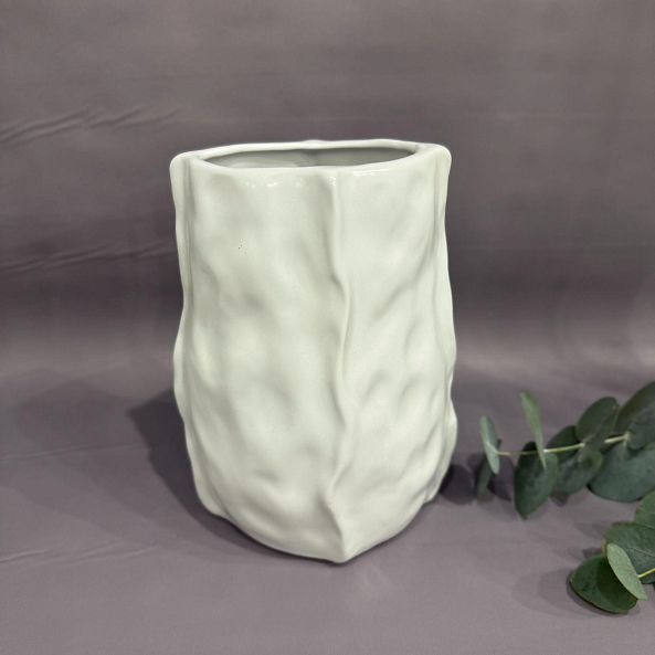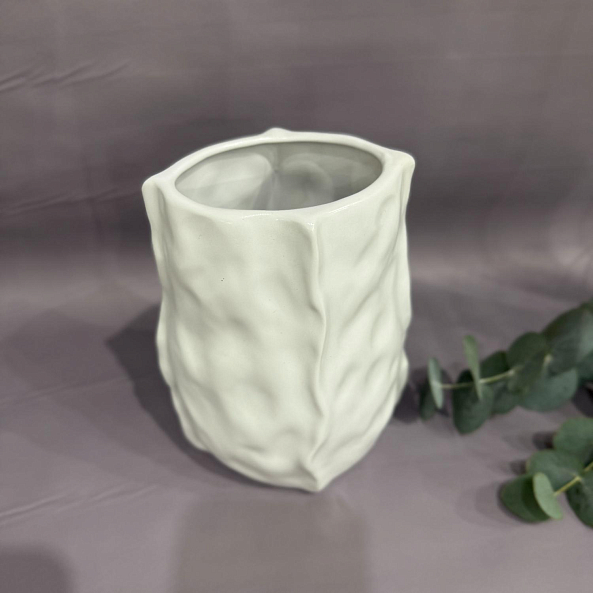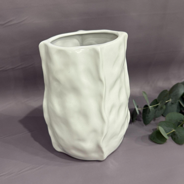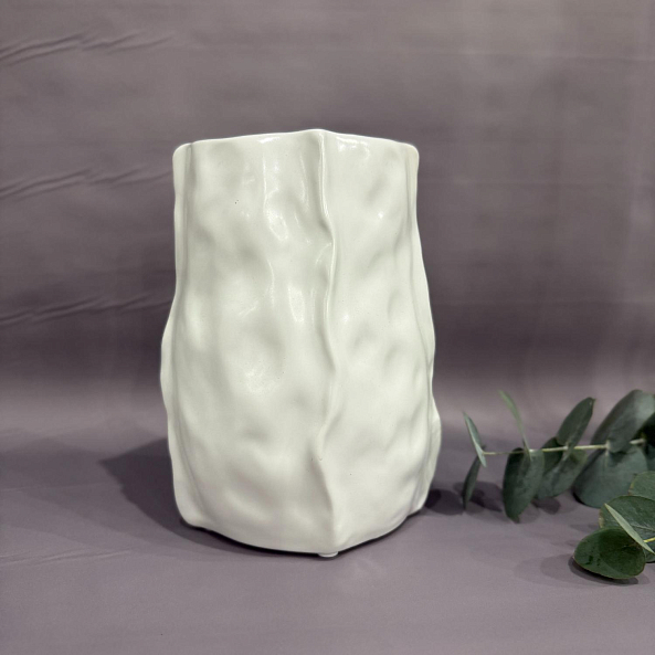 Керамическая ваза белого цвета с оригинальной драпированной текстурой, напоминающей складки ткани. Элегантный и современный дизайн подходит для декора интерьера в стиле минимализм, лофт или скандинавский. Идеально сочетается с цветами, ветками или используется как самостоятельный декоративный элемент.