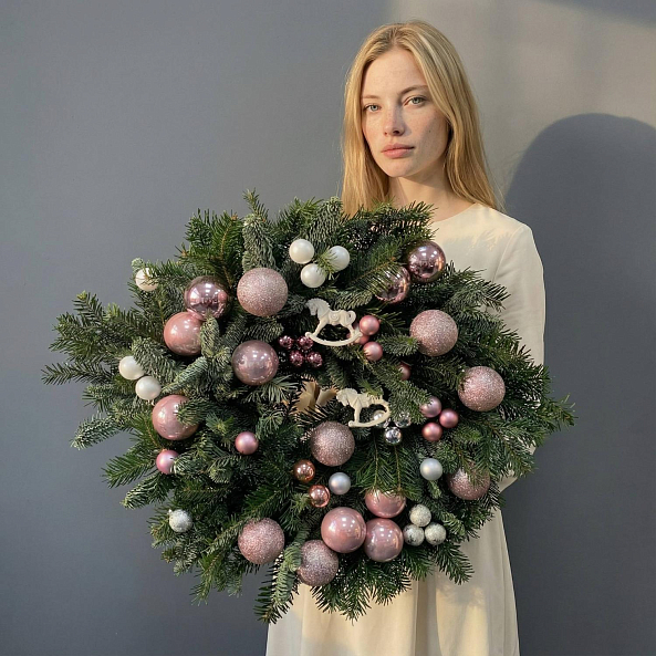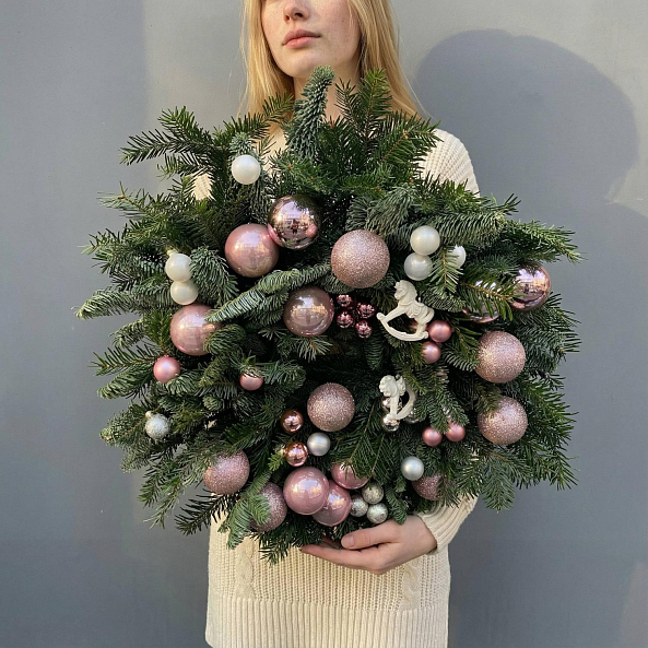 Пышный венок из свежей хвои, украшенный розовыми и перламутровыми шарами, — это не просто украшение, а целая атмосфера зимнего уюта. Идеален для дома, офиса или в качестве подарка.