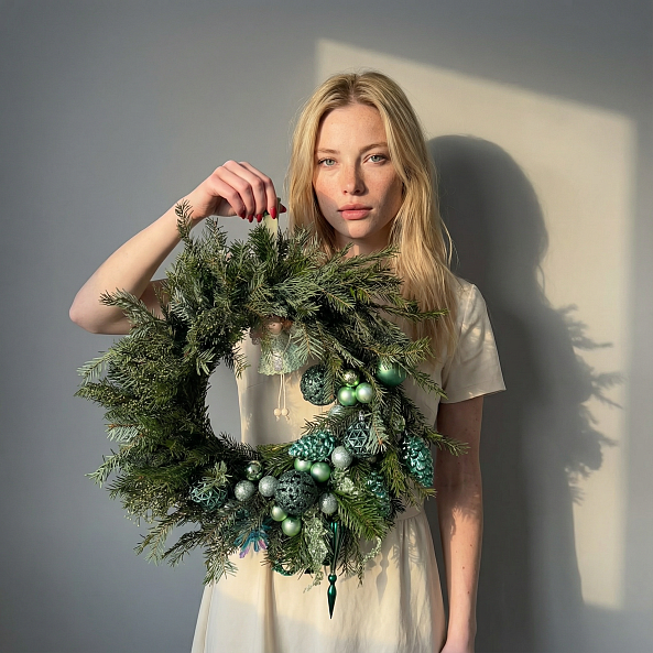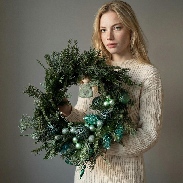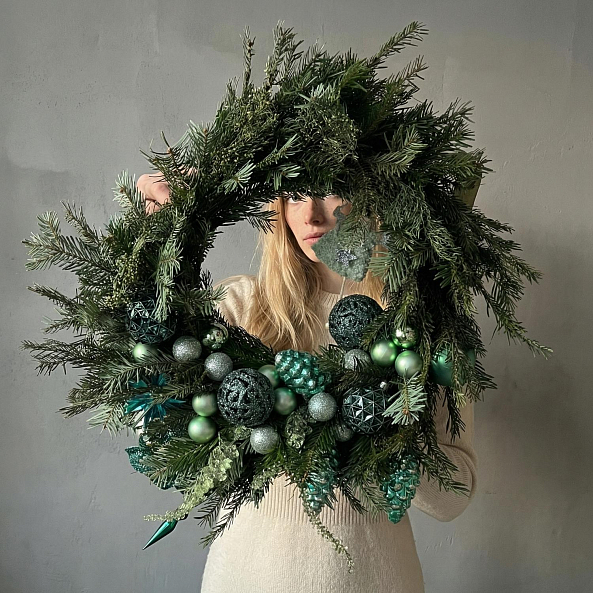 Пышный венок из свежей хвои, украшенный зелёными и серебряными шарами — это не просто украшение, а целая атмосфера зимнего уюта. Идеален для дома, офиса или в качестве подарка.