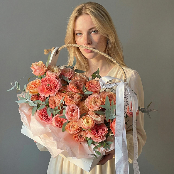 Этот ящик — настоящий подарок для ценителей изысканности. В нем собраны пышные пионовидные розы двух сортов: нежно-персиковые «Леди Априкот» и теплые оранжево-розовые «Лондон Ай». Каждая роза обладает плотной, многослойной чашей, напоминающей пион, и дарит ощущение роскоши при каждом взгляде. Свежий эвкалипт добавляет композиции объем, аромат и легкую воздушность, подчеркивая утонченность букета. Цветы аккуратно уложены в стильный деревянный ящик — он не только служит упаковкой, но и становится частью подарка. Ящик можно оставить как декор для дома или использовать по хозяйству, а цветы легко достать и поставить в вазу, чтобы продлить их свежесть.