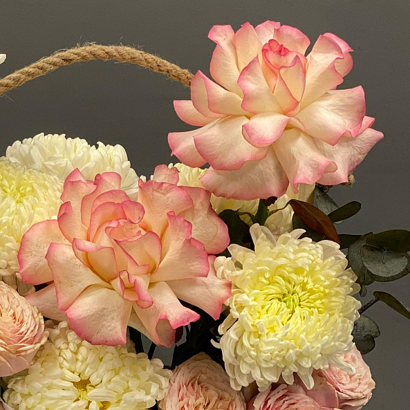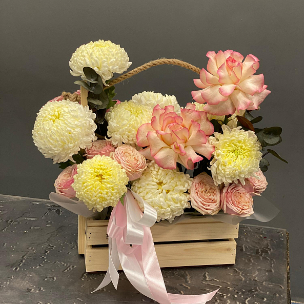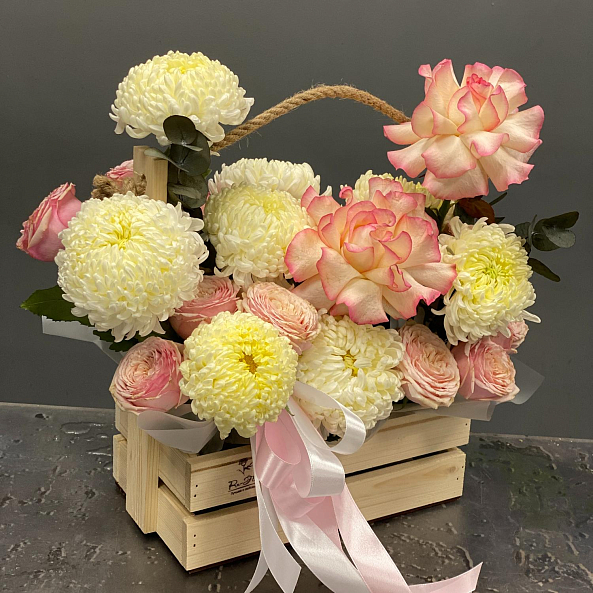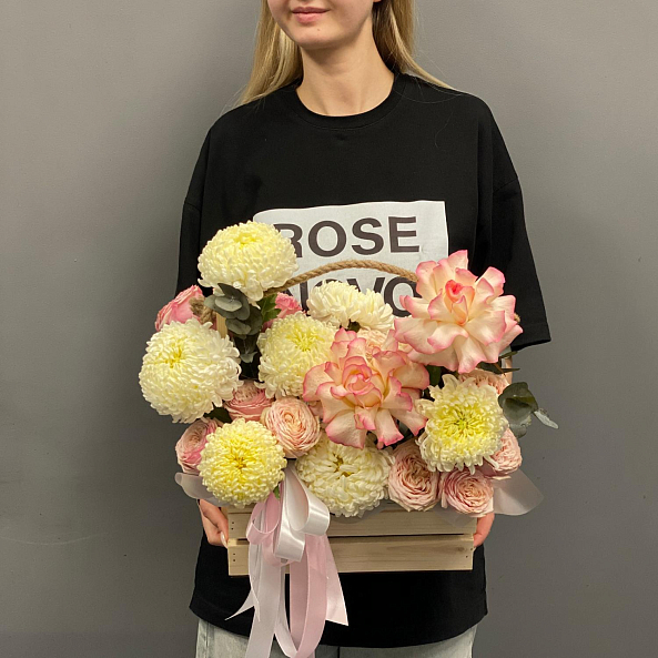 Роскошный и нежный букет в деревянном ящике с джутовой ручкой. Композиция объединяет французскую розу «Джумилия» с ее насыщенным розовым оттенком, кустовую пионовидную розу «Спешл Дайменшн», одноголовую хризантему и свежие веточки эвкалипта цинерии. Цветовая гамма — от нежного персика до насыщенного розового — создает ощущение уюта, спокойствия и утонченности. Упаковка в стильный ящик с лентами делает подарок готовым к вручению — идеальный выбор для любого повода, от дня рождения до просто «потому что ты особенная».