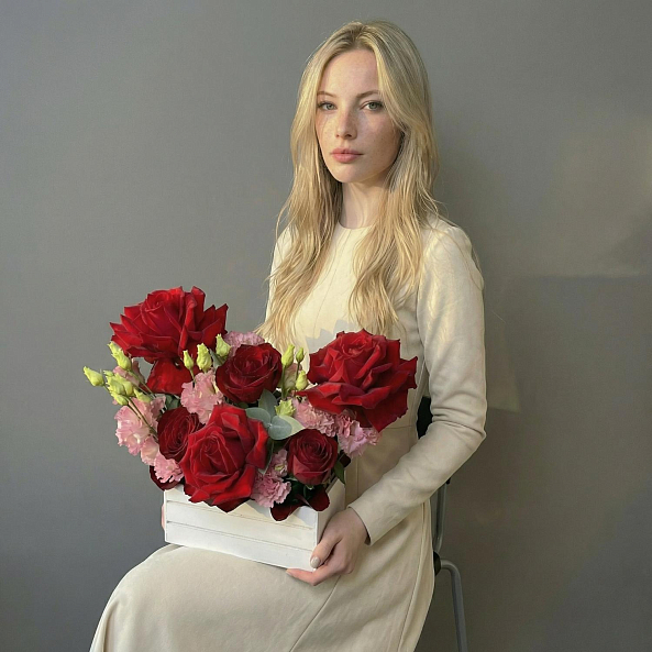 Этот ящик — настоящий подарок для ценителей глубины и изысканности. В нем собраны роскошные французские розы «Эксплорер» с насыщенным бордовым оттенком и идеальной формой бутона, которые символизируют страсть и утонченность. Их дополняют нежные розовые махровые эустомы — они добавляют композиции воздушности, романтики и легкой игривости. Яркие красные розы «Мадам Ред» придают букету силу и выразительность, создавая контраст, который невозможно не заметить.