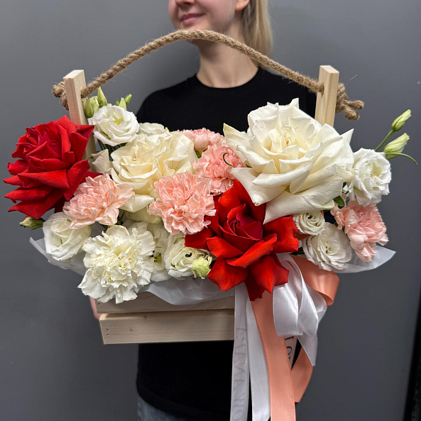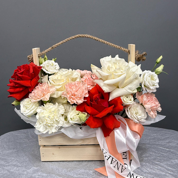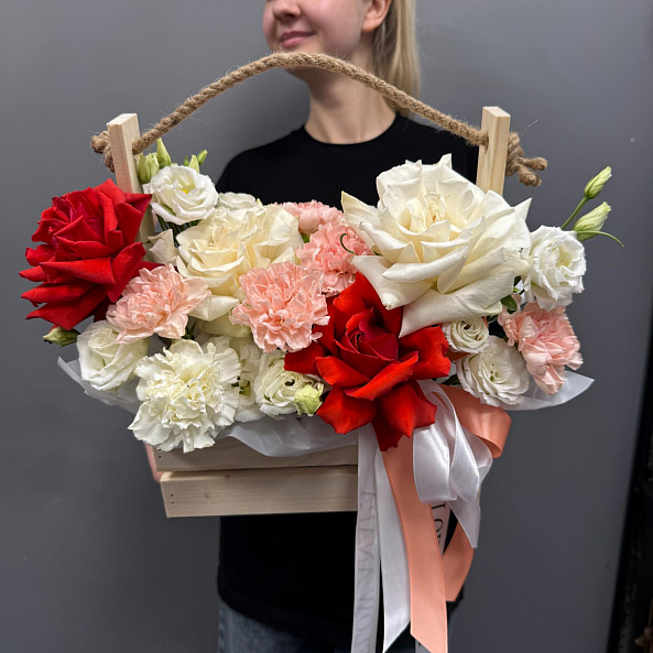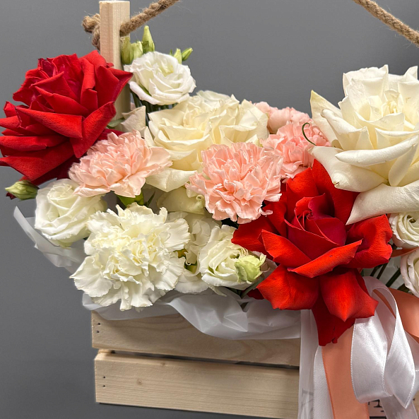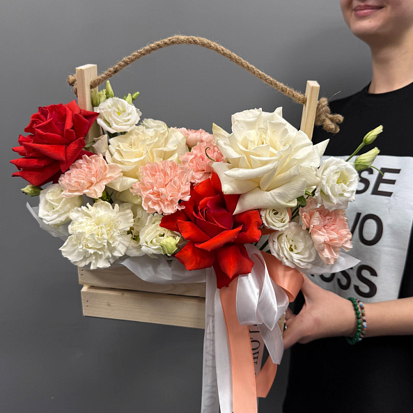 Ящик с цветами — элегантный и роскошный подарок для любого повода. В композиции: белые и красные французские розы, белая эустома, гортензия, а также белая и кремовая гвоздика. Упакован в деревянную коробку с верёвочной ручкой и лентой — выглядит стильно, празднично и дорого. Идеально подойдёт для Дня святого Валентина, годовщины или как знак глубокого уважения и любви.