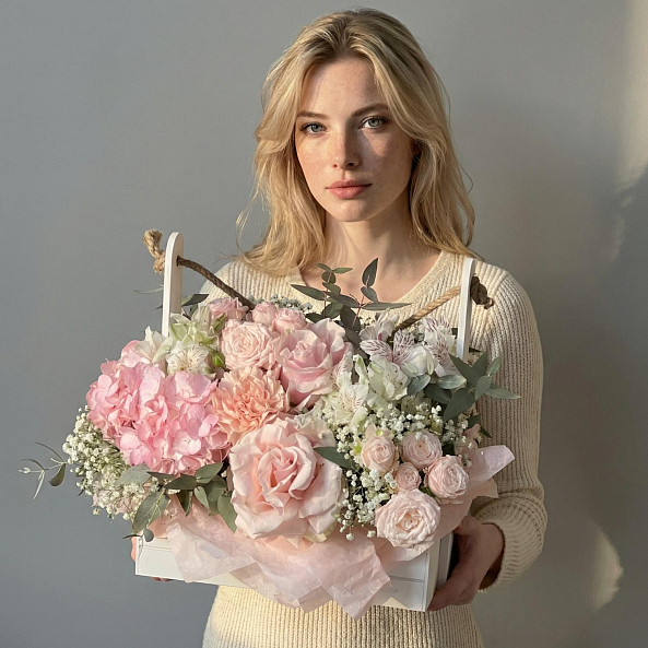 Гортензия, французские розы, белая гипсофила, пионовидные розы, альстромерии и эвкалипт — это не просто букет, а целая история. Идеален для тех, кто хочет подарить не просто цветы, а целое настроение.