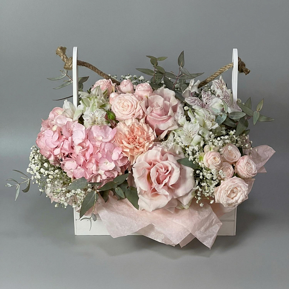 Ящик с цветами. Гортензия, Французская Роза, Гипсофила Белая, Кустовая Пионовидная Роза, Альстромерия, Эвкалипт.