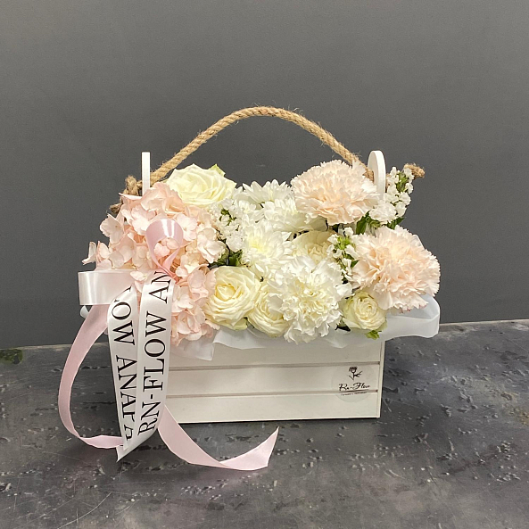 Ящик с цветами. Гортензия Нежно-Розовая, Хризантема Кустовая "Алтай", Статица, Кустовая Пиновидная роза "Вайт Пиони", Гвоздика (Диантус).