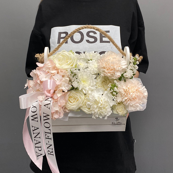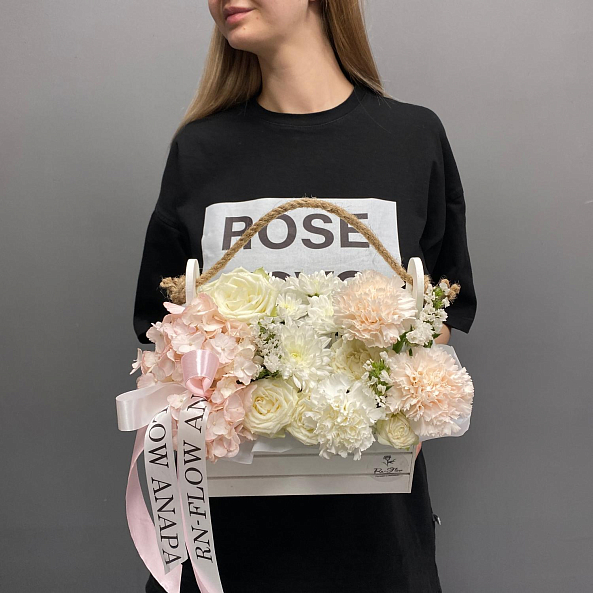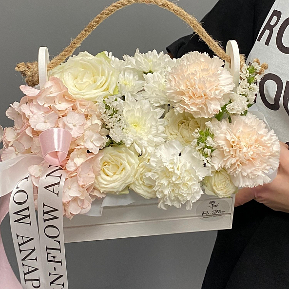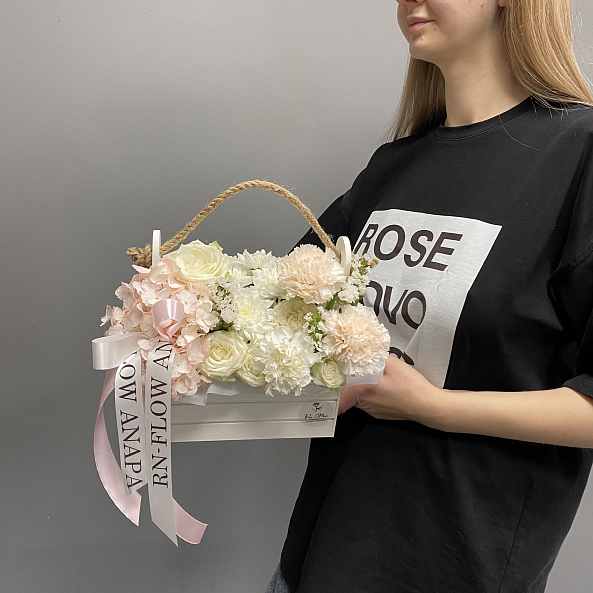Ящик «Нежный уют» — Гортензия + Розы + Хризантемы + Гвоздики
