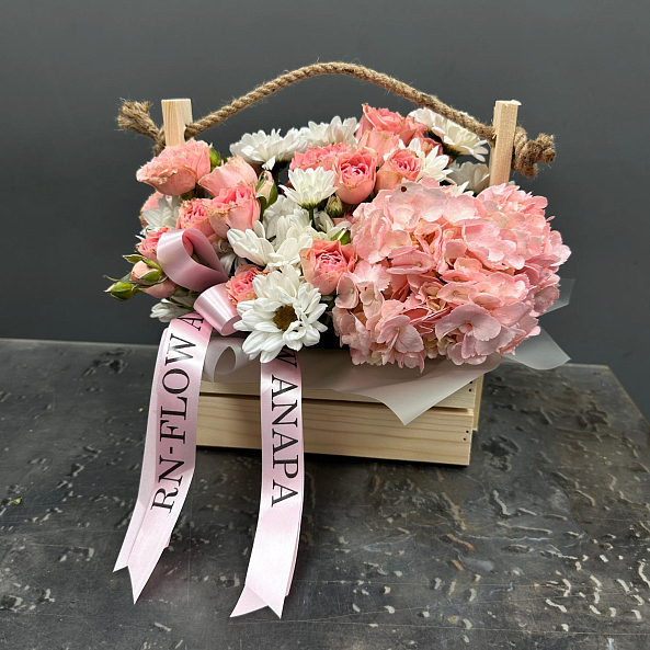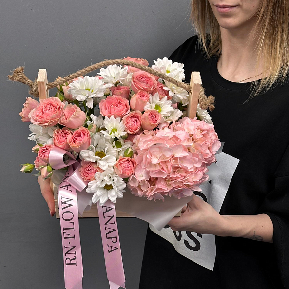 Ящик с цветами. Гортензия Розовая, Кустовая Пионовидная Роза "Спешл Дайменшн", Хризантема Кустовая "Чик".