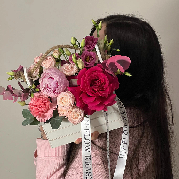 Роскошный букет в белом деревянном ящике с джутовой ручкой, созданный для тех, кто ценит изысканность и глубину. Композиция объединяет пышный пион «Сара Бернар» с нежно-розовыми лепестками, кустовую пионовидную розу «Мисс Пиони», нежную розовую эустому и насыщенную французскую розу «Фулл Монти». Цветовая гамма — от нежного персика до глубокого малинового — создает ощущение праздника и тепла. Дополняют композицию свежие веточки эвкалипта и декоративные элементы. Ящик с лентой делает подарок готовым к вручению — идеальный выбор для особенного момента.