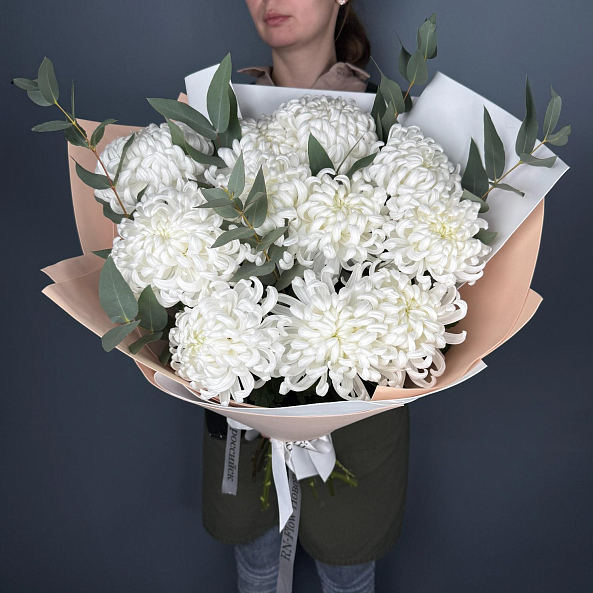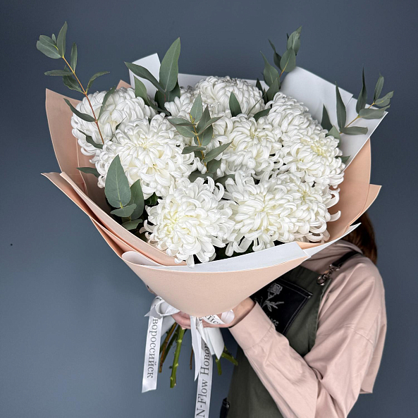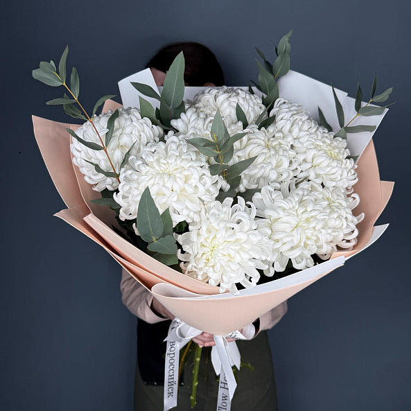 Пышные белые хризантемы и свежий эвкалипт — это не просто букет, а целая атмосфера. Идеален для тех, кто ценит простоту, доброту и гармонию.