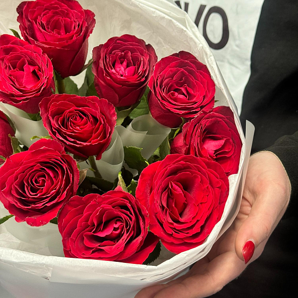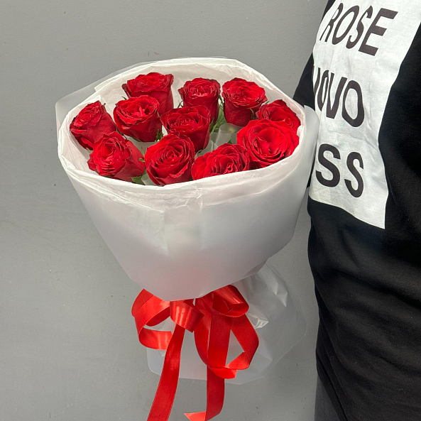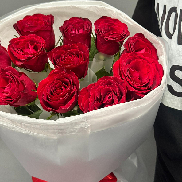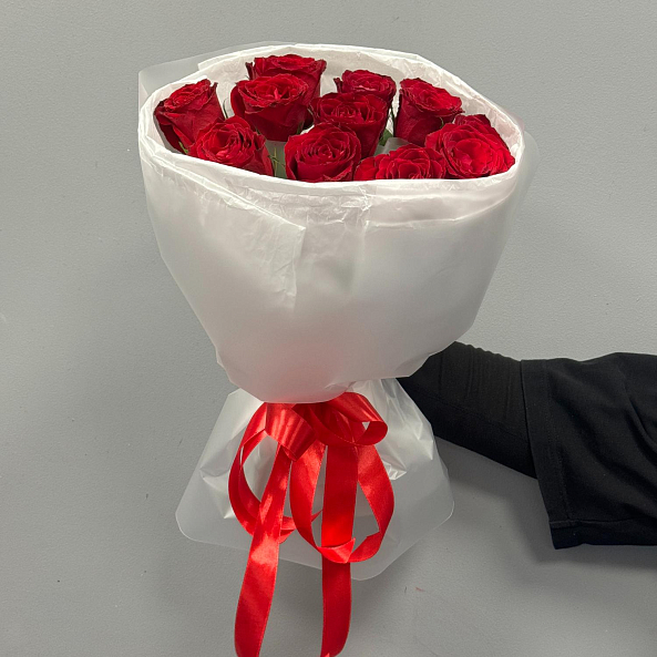 11 красных роз сорта "Мадам Ред" в белом оформлении