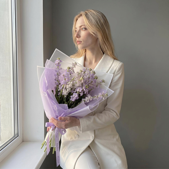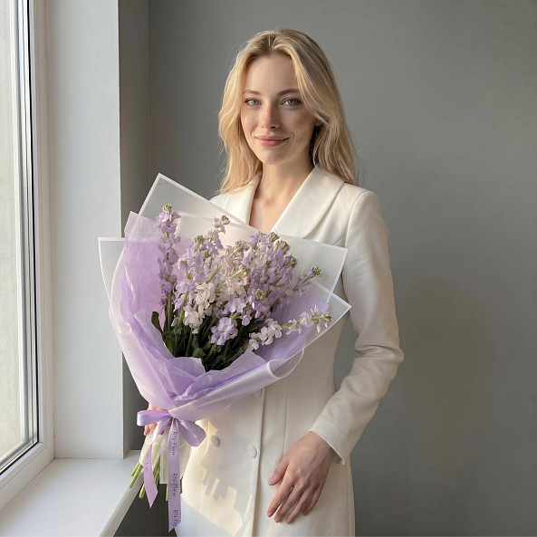 Этот изысканный букет — настоящая симфония гармонии и контраста, где 15 стеблей маттиолы «Пустошка» в сочетании лавандовых и нежно-розовых оттенков создают объемную, ароматную композицию, словно застывший момент из самого романтического уголка весеннего сада.