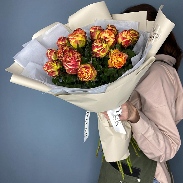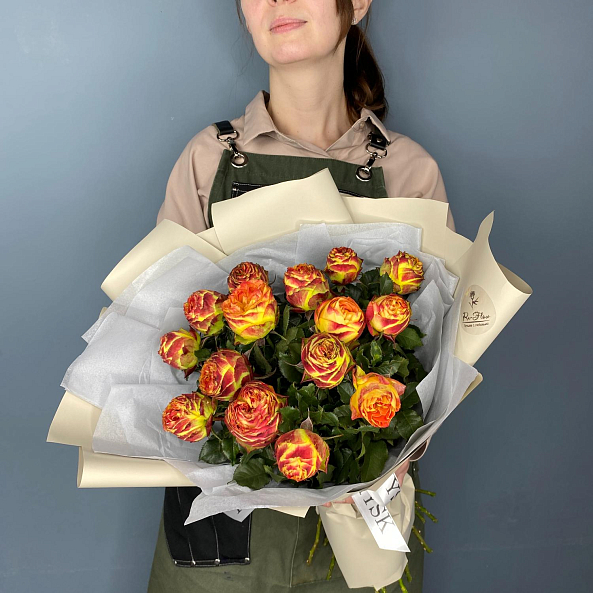 Яркая роза 40 см с пылающими оттенками оранжевого, красного и желтого — настоящий огонь страсти в одном бутоне. Идеальный выбор для тех, кто хочет подарить нечто запоминающееся и яркое.