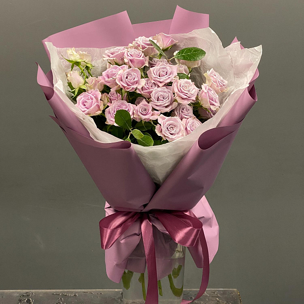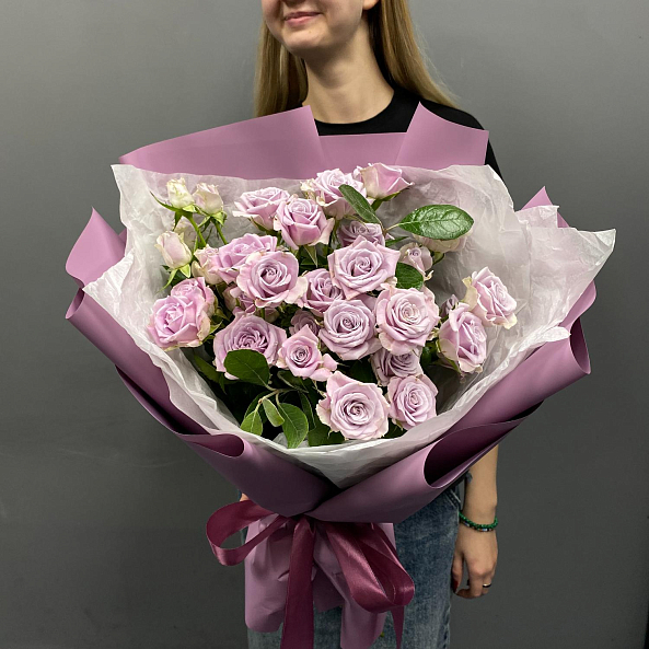 Букет из фиолетовых роз — тонкая гамма загадочности и романтики. Нежные, чуть пастельные оттенки цветов создают атмосферу утончённой красоты и спокойствия. Упакован в матовую лиловую бумагу с атласной лентой — идеальный выбор для тех, кто ценит изысканность и хочет подарить не просто цветы, а настроение. Подойдёт как для особого случая, так и для простого, но трогательного жеста.