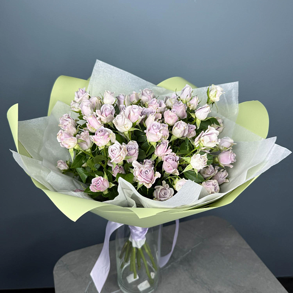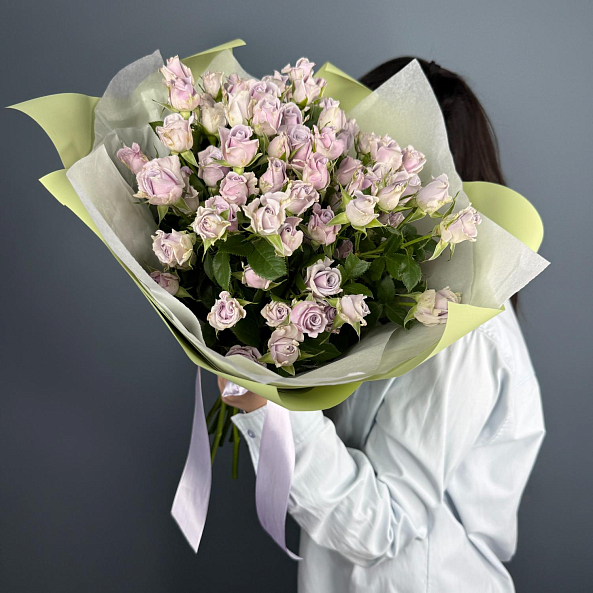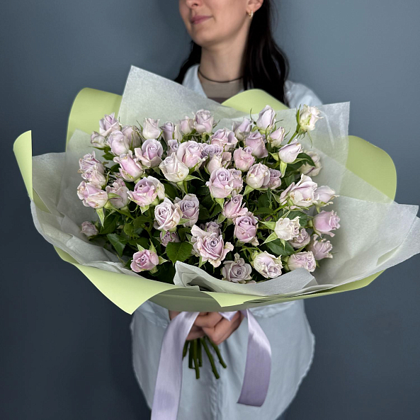 Букет из 15 кустовых роз «Сильвер Шедоу» 50 см — нежная симфония лиловых оттенков с серебристым шармом. Пышные, словно мини-пионы, цветы на длинных стеблях создают объёмный, воздушный и очень женственный букет. Упакован в светло-зелёную бумагу с лентой — идеален для романтического подарка, дня рождения или просто чтобы порадовать близкого человека. Элегантность, свежесть и изысканность в каждой детали.